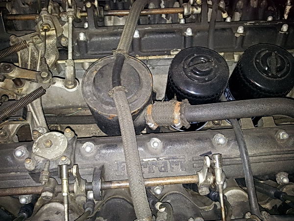 Rechts sind die beiden Ölfilter zu sehen, links der große Zylinder ist der Öldampfkondensator des Kurbelwellen-Entlüftungsgehäuses.