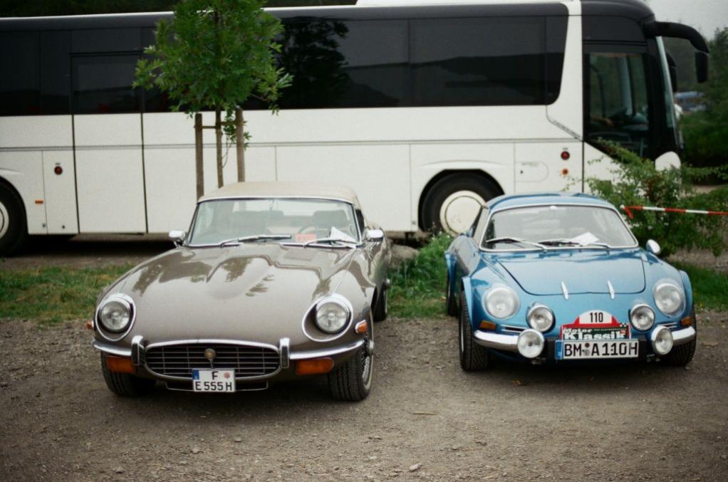 Aber auch an schönen und nicht alltäglichen Einzelfahrzeugen gibt es auf den Besucherparkplätzen in der Regel einiges zu sehen, weshalb sich ein kurzer Rundgang lohnt. Hier ein Jaguar E-Type und eine Renault Alpine.