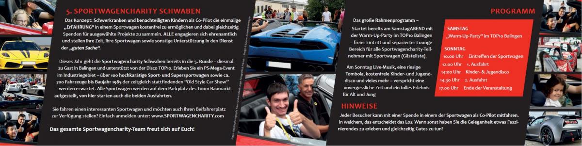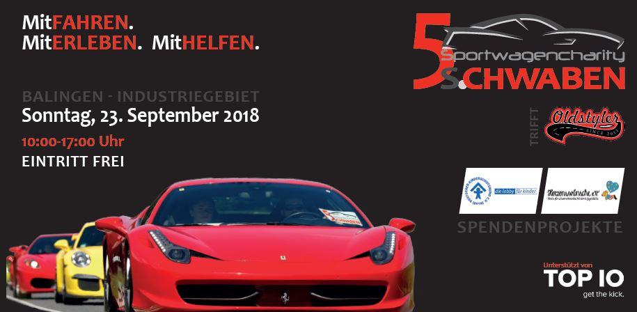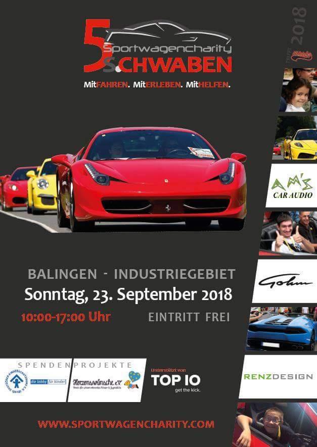 nach den vergangenen Erfolgen haben wir uns dazu entschlossen, die 5. Auflage der Sportwagencharity Schwaben zu veranstalten. Dieses Jahr sind wir zu Gast in Balingen und werden vom Club TOP10 unterstützt (gibt ach eine Opening Party am Vorabend). Wir schließen uns damit der zeitgleich stattfindenden “Old Style Car Show” an, was zu einem Megaevent im Industriegebiet Balingen führt. Es werden ca. 700 Fahrzeuge bis Baujahr 1985 erwartet und zusätzlich noch über 100 hochkarätige Sport- und Supersportwagen. Es gibt Live-Musik, eine riesige Tombola und einen Special Guest.