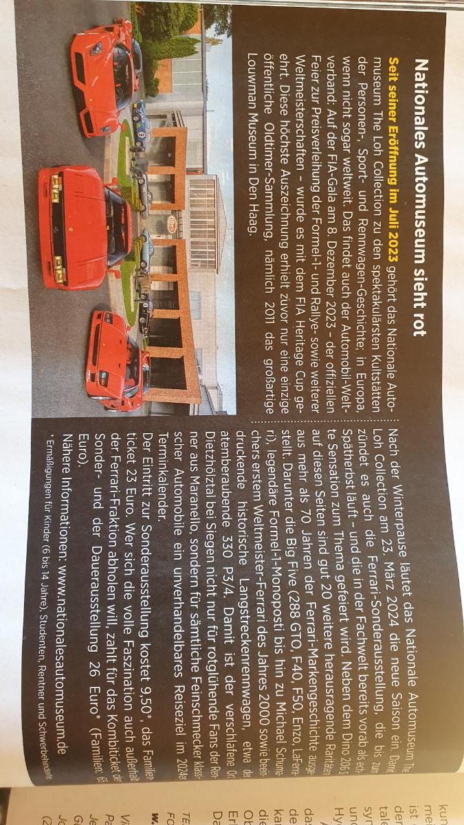 • Um 15:00 Uhr beginnt unsere exklusive Führung durch die Loh-Collection. Etwas mehr Gewichtung wird auf die Ferrari-Sonderausstellung und besonders seltene Ferrari gelegt werden. Die geführte und inhaltlich sehr informative Führung erlaubt euch jederzeit Fragen zu stellen und zu fotografieren. Die Führung dauert rund 90-Minuten