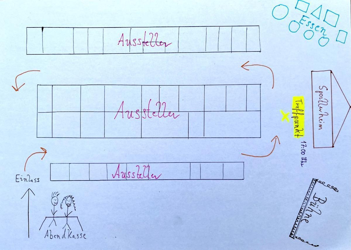 Der Eintritt kostet 5€, Kinder bis 12-Jahre erhalten freien Eintritt. Treffpunkt ist wie in den letzten Jahren wieder um 17:00 Uhr am Ende des Weihnachtsmarkts vor dem Sportlerheim (Holzhütte) neben der Bühne. Einfach nach dem Einlass gleich rechts abbiegen und einmal runterlaufen bitte. Anbei eine kleine Skizze um sich unseren Treffpunkt besser vorstellen zu können.
