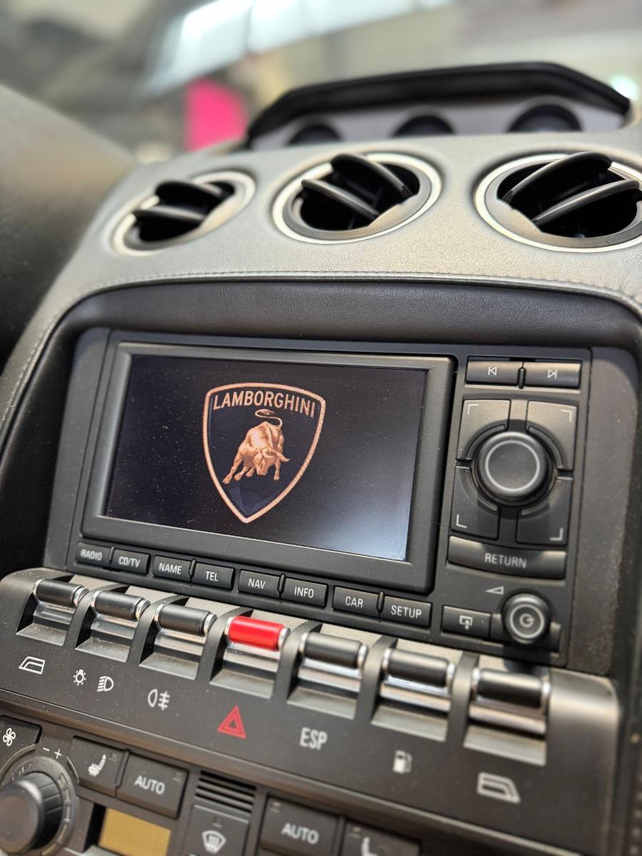 1. Radio/Navigatioseinheit Doppel-DIN OEM 400035192F: alles tipptopp, Bildschirm motorisiert und klappt aus wenn man an die Speicherkartenslots will. Die letzte und finale Naviversion die vor ein paar Jahren veröffentlicht wurde habe ich im Internet von einem Anbieter erwerben können und gebe ich gerne mit dazu. Bei Start kommt das Lambo Emblem da OEM, wurde original von Lambo seinerzeit verbaut