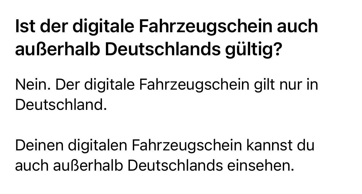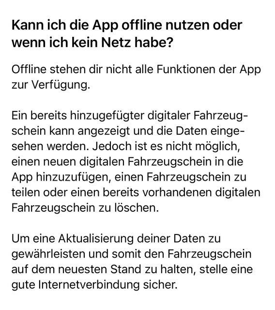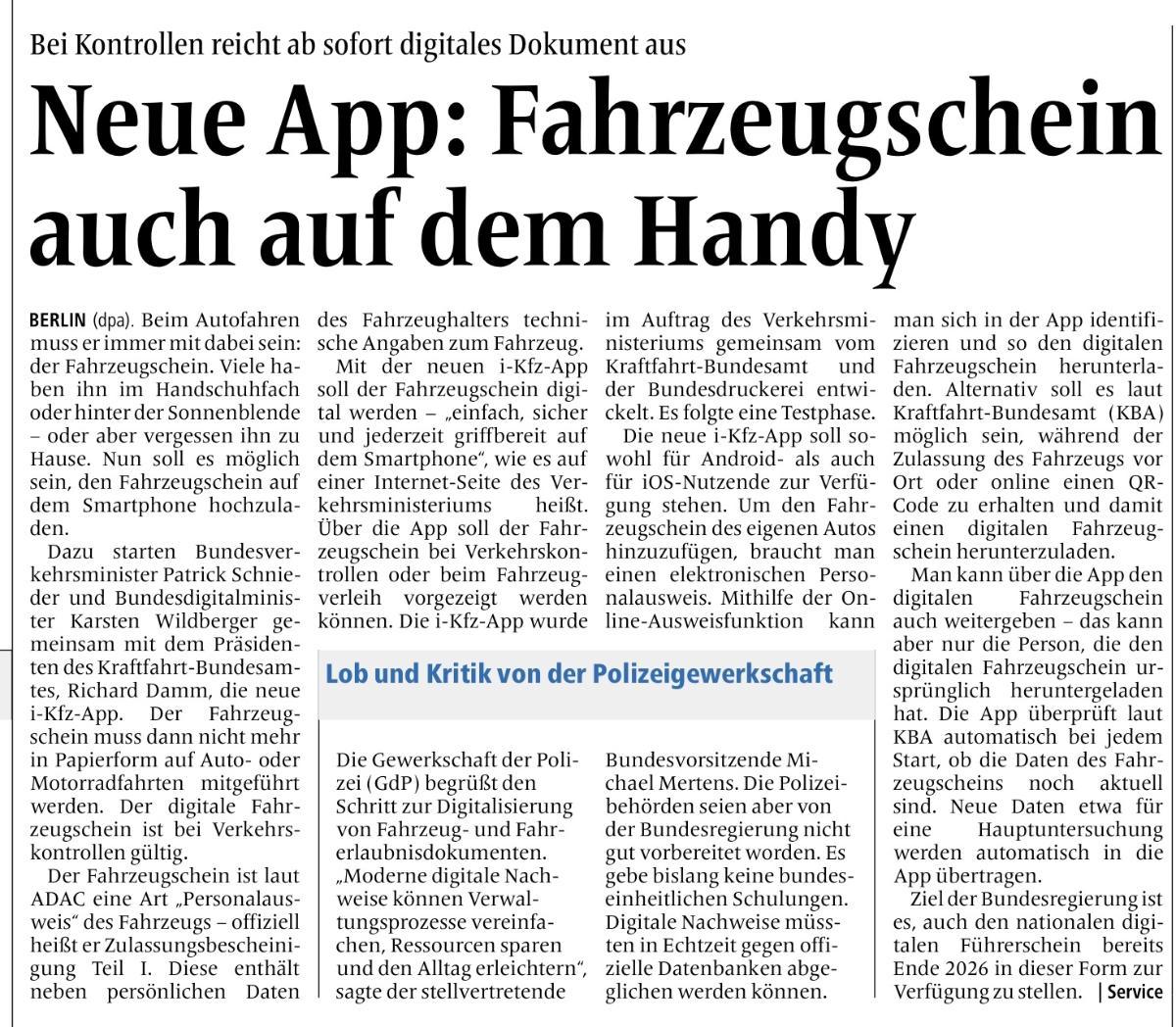 Heute morgen in meiner Zeitung: (Zum Vergrößern bitte anklicken) Wer kennt es nicht: man vergisst den Kfz-Schein zu Hause, hat ihn im anderen Portemonnaie etc. Oder es nervt, das klebrige Ding (da ist ja mittlerweile ein Klebesiegel drauf, was in der Brieftasche eklig klebt). Ich denke, gerade hier auf CP haben die meisten mehrere Autos, da hat man vielleicht mal den falschen Kfz-Schein dabei, zudem wird die Brieftasche voller etc. (Mir ist bewusst, dass die korrekte Bezeichnung Zulassungsbescheinigung Teil I heißt. Aber ich bin nun mal old school). Das alles soll bis Ende 2026 zur Verfügung stehen. Na ja, das kann dann ja dauern, dachte ich. Unsere Behörden sind im Umsetzen in der digitalen Welt ja oft langsam. Ach, schau doch mal beim KBF (Kraftfahrtbundesamt) auf die Seite, dachte ich. https://www.kba.de/DE/Themen/ZentraleRegister/iKfz_App/DFZ/dfz_node.html Und siehe da: das gibt es schon. Man kann sich die App herunterladen. Das habe ich schnell mal gemacht. Für die App benötigt man nichts weiter, die Daten werden online abgefragt. Man benötigt lediglich einen digital lesbaren Personalausweis sowie die PIN dazu. Und schwupps, habe ich mal eben meine drei Kfz-Scheine heruntergeladen. Installation der App plus Download hat vielleicht 10 Minuten gedauert. Jetzt habe ich meine Kfz-Scheine immer dabei. Bei einer Verkehrskontrolle sind die jetzt gültig, man benötigt sie dort nicht mehr auf Papier. Lediglich im Ausland wird das nicht anerkannt, dort benötigt man weiterhin den Schein im Original. Aus den FAQ der App: Wenn man offline ist (was in unserem löcherigen Funknetz ja oft vorkommt), hat man die Daten trotzdem in der App. Hier mal Auszüge aus der App. Die Autos kann man in der App personlisieren, also Nicknames vergeben, die Symbole farbig machen etc. (Zum Vergrößern bitte anklicken)