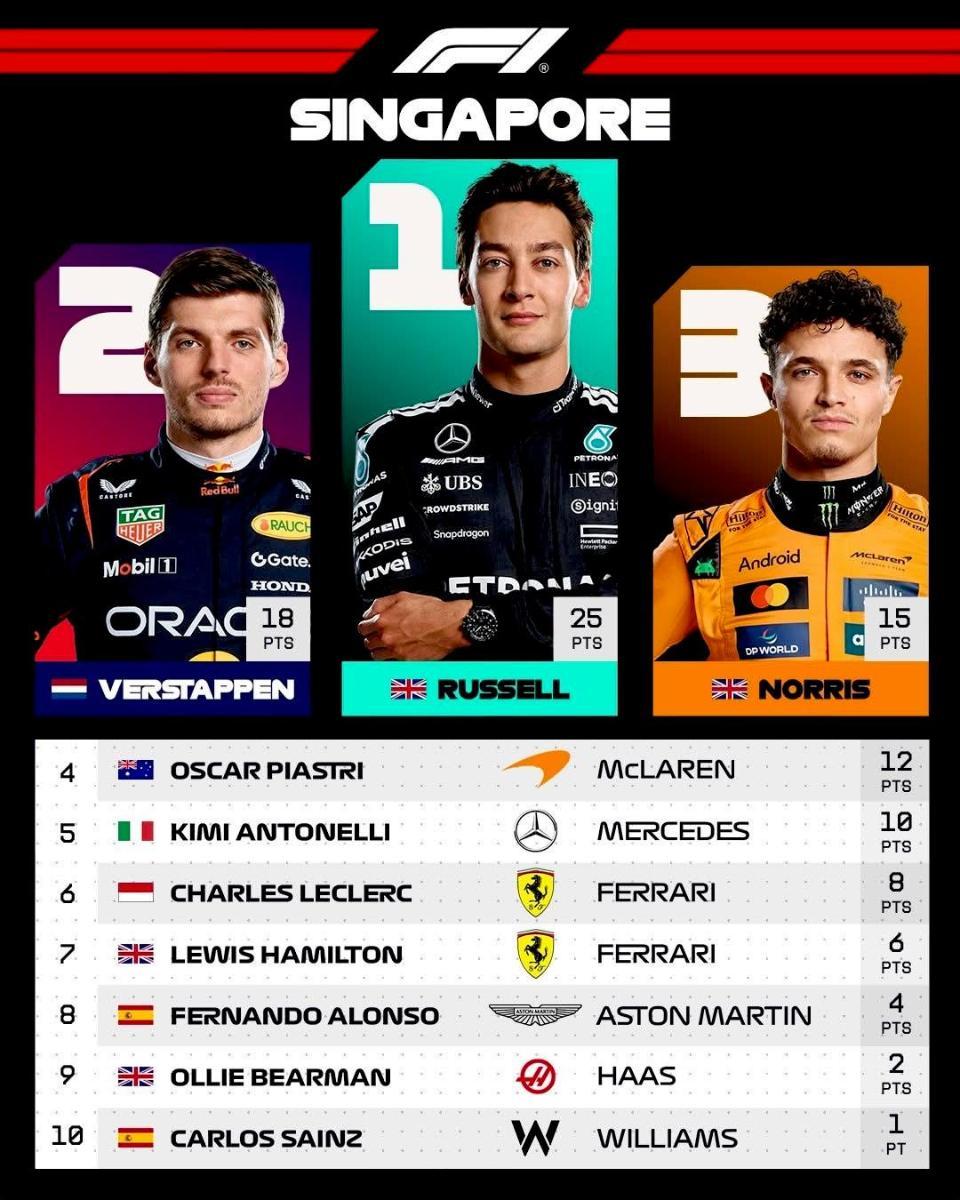 Liebe Forumskollegen, wie gewohnt wollte ich auch heute wieder einen Link zur Rennzusammenfassung posten. Allerdings war der heutige Grand Prix in meinen Augen leider derart langweilig, dass ich mir den Schritt diesmal gerne sparen möchte. Aus meiner Sicht lohnt es sich schlichtweg nicht das Rennen nachzuschauen, es wäre vergeudete Zeit. Abgesehen von einer kurzen spannenden Szene direkt nach dem Start, als Norris sich erst an Antonelli und dann an seinem Teamkollegen vorbeischieben konnte, passierte praktisch nichts Nennenswertes. Hier das Endergebnis von heute: Ich hoffe auf ein unterhaltsameres Rennen beim nächsten Mal! Motorsportliche Grüße, Sarah