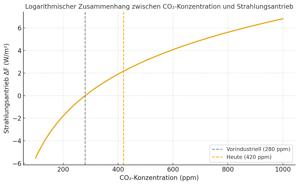 Thema "CO2-Sättigung": CO₂ absorbiert Wärmestrahlung (Infrarot) in bestimmten Wellenlängenbändern, insbesondere um 15 µm. Diese Bänder liegen im Infrarotbereich, in dem die Erde Wärme abstrahlt. Je mehr CO₂ in der Atmosphäre ist, desto mehr Strahlung wird in diesen Bändern absorbiert — aber: Irgendwann werden diese Bänder gesättigt, d. h. sie absorbieren schon fast alles, was in dieser Wellenlänge ankommt. Bedeutet: Die Kurve wird immer flacher, je höher die CO2-Konzentration. Damit nimmt der sogenannte Steuerungseffekt des CO2 ab. Gans schön schlau Mutter Natur und die Physik.