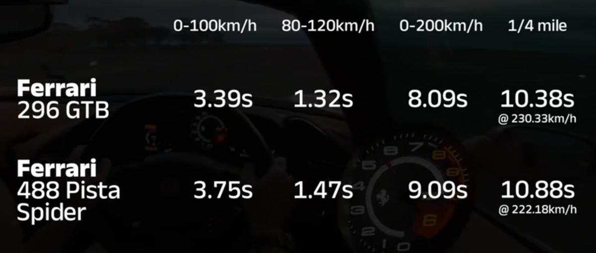 296GTB oder 488 Pista? Ich denke jeder wird sich für den Pista entscheiden. Ich würde es zumindest tun. Dennoch, schaut man sich die beiden im direkten Performance Vergleich an, muss man den Ferrari Ingenieuren eine tolle Leistung zugestehen. Der Pista mit seinem V8 Biturbo wiegt gut 100kg weniger als der 296 mit V6 Biturbo/Hybrid. Und dennoch wird er im Drag Race gnadenlos in Grund und Boden gefahren. Wer auf Performance steht, muss dem 296 seine Berechtigung zugestehen. Momentan bekommt man bei Ferrari bei keinem Modell mehr Performance Auto fürs Geld. Jetzt könnt ihr gerne über meinen (Nicht-KI) Beitrag herfallen und ihn in Grund und Boden reden. 😁 Nachtrag Anbei die gemessenen Daten des Vergleichs. Die Zeiten zeigen, dass aufgrund des schlechten FahrbahnBelags beide Fzge nicht ihr volles Potential ausspielen konnten. Für den direkten Vergleich spielt das aber keine Rolle.