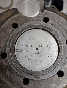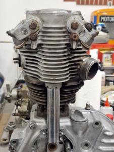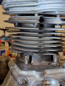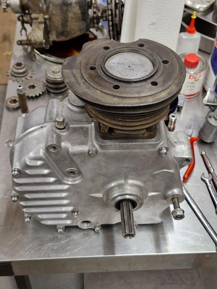 So, während der Wartezeit bis die neue Zündspuleneinheit für den Maranello ankommt, kann es mir der NSU weiter gehen. Die beiden Gehäusehälften, mit der Kurbelwelle, müssen, wie angemerkt, ohne Papierdichtung montiert werden. Ich verwende Mannol Seal Maker, auf Silikonbasis. Zusammengesteckt (Passstift nicht vergessen) und die Schrauben leicht angezogen. Endanzug der Schrauben der Gehäusehälten erst nach dem Aushärten des Silikons. Dann muss der Kolben auf dem Pleuel montiert werden, das geht flott. Dann muss der Zylinder über den Kolben gestülpt werden, mit seinen insgesamt 4 Kolbenringen. Geht per Hand relativ gut. Beim Kolben muss man darauf achten, dass er außermittig angelenkt ist, daher der Hinweis "vorne" auf dem Kolbenboden. Der Zylinderfuss (mit Papierdichtung) ist recht einfach zu befestigen. Wie man sieht sind nicht nur Motorblock und Rahmen "matching numbers", sondern auch der Zylinder. Spaßiger sind die Zylinderkopf Verschraubungen. Einfach aufsetzen und Verschrauben ist nicht. Man muss den Kopf mit Abstand ansetzen, dann die 6 Bundmuttern unter den Bolzen mittels einer Pinzette positionieren, den Kopf ablassen, bis die Bolzen auf den Muttern ruhen, und schließlich die Muttern rundum laufend Stück für Stück anziehen. Das Ergebnis sieht dann so aus. Im Kopf ist noch nicht eingestellt, es muss dafür das Steuergehäuse mit Nockenwelle und Stößelstangen montiert werden. Das kommt als nächstes. Alldieweil ein Teaser für Gichtkranke: -