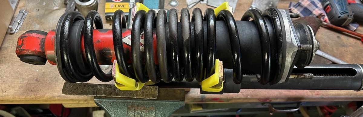 Um das Federbein aus bauen zu können, muss der untere Bolzen M12/SW 19 und die vier Muttern am Domdeckel M8/SW 13 abgeschraubt werden. Zuvor sollte man den Vorderwagen anheben das Vorderrad demontieren und dann den Wagen auf dem Chassis auf einer stabilen Stütze ablegen. Damit der untere Dreieckslenker weit genug nach unten bewegt werden kann muss der Bolzen von der Koppelstange des Stabilisators entfernt werden ( Inbusschraube M12 / 8mm Sechskant / SW 19 ). Um den oberen Dreieckslenker nach oben drücken zu können müssen nun die beiden M10 Bolzen des Kugelkopfes am oberen Ende des Achsträgers abgeschraubt werden. Die Anzahl der Shims vorne und hinten muss man auf jeden Fall dokumentieren und beim Zusammenbauen wieder an ihre Position bringen. Während dieser Arbeiten sollte man den unteren Querlenker mit einem Wagenheber abstützten. Ist der Achsträger gelöst muss dieser mit einem Draht oder ähnlichem so fixiert werden, das die Bremsleitung nicht übermassig strapaziert wird. Da die untere Buchse vom Stoßdämpfer recht stramm in seiner Position sitzt kann man sie mit einem ummantelten Schraubendreher vorsichtig heraushebeln und dann das ganze Federbein zur Seite ( linke VA nach rechts/ rechte VA nach links ) herausnehmen. MfG Lars