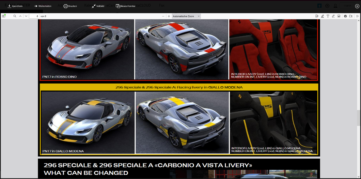 Kürzlich kam von meinem Autohaus eine Info für ein limitiertes Paket für den 296 Speciale und Speciale Aperta. Habe das nur mal überflogen und mir bisher noch keine Gedanken gemacht, wie ich den Speciale Aperta konfigurieren werde. Meines Wissens sind die hier aufgelisteten Carbon-Teile, Scudettis, Lift etc. doch Serie und für mich daher aktuell nicht ganz nachvollziehbar, weshalb die als Extra in diesem Paket für 131K netto nochmals aufgelistet sind. Ist Euch hierzu nähers bekannt? Cool sehen die Beispielbilder ja aus. Hierzu der mir vorliegende Infotext: --- Im Rahmen der Konfiguration des Ferrari 296 Speciale & Ferrari 296 Speciale Aperta bietet Ferrari die Möglichkeit zur Bestellung einer limitierten Racing-Konfiguration. Die exklusive „Carbonio a vista Livery” zeichnet sich durch einige Sichtcarbon-Elemente und eine besondere Racing-Lackierung aus. Zudem sind im Anhang mehrere Visualisierungen der „Carbonio a vista Livery“ beim 296 Speciale & 296 Speciale Aperta zu sehen. Die „Carbonio a vista“-Lackierung ist streng limitiert und nur in sehr geringen Stückzahlen verfügbar. Konfiguration „Carbonio a vista livery“ – verpflichtende Ausstattungsmerkmale SFCL – Carbonio a vista-Lackierung PACF – Frontstoßstange aus Carbonfaser (nicht in Sichtcarbon) FCWS – Mittlerer und seitlicher Frontspoiler in glänzender Carbonfaser CEXS – Seitenschwellerverkleidung in glänzender Carbonfaser CEXD – Heckdiffusor in glänzender Carbonfaser CEL2 – Motorabdeckungen in glänzender Carbonfaser CESP – Heckspoiler in glänzender Carbonfaser NRCC – Lüftungsgitter in glänzender Carbonfaser WING – Gamma-Flügel in glänzender Kohlefaser → nur bei dieser Version ist auch die Außenfläche in sichtbarer Carbonfaser PNT7 – Außenlackierung in 3 Farben: AZZURRO DINO, ROSSO DINO oder GIALLO MODENA BIC2 – Schwarzes Dach CERB / CERG – Heckhaube aus Carbonfaser Preis der verpflichtenden Ausstattungsoptionen: €131.557,00 netto Konfiguration „Carbonio a vista livery“ – exklusive weitere Ausstattungsoptionen nur verfügbar mit „Carbonio a vista livery“ (nicht im Preis inkludiert) LIIN – Innenausstattung passend zu PNT7 (Außenlackierung) NUIN – Nummer im Innenraum 1NSF – Nummer auf der Motorhaube 2NSF – Seitennummern Preise auf Anfrage! Konfiguration „Carbonio a vista livery“ – weitere Ausstattungsoptionen (nicht im Preis inkludiert) Alle Funktionsoptionen (z. B. Lift-System) Außenfarben Felgen Standardlogo oder Airbrush-Logo (LOGO oder ALO1) Innenausstattung (ALDT, Sicherheitsgurte, Teppich, unteres Armaturenbrett usw.) Innenausstattung mit Carbonfaser-Details