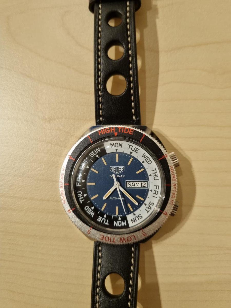 Heuer Solunar ("Gezeitenuhr") (M)ein seltenes Schätzchen - dieses Jahr 50 Jahre alt. Habe lange nach einer in gutem Zustand gesucht und vor kurzem "meine" in Sammlerzustand endlich gefunden! Ist jetzt gerade bei meinem Uhrmacher zur Revision. Zustand war wohl gut, aber Öl und Dichtungen (natürlich) überholungsbedürftig - obwohl sie die Zeit eigentlich noch gut gehalten hat. Ist nicht die "teuerste" Uhr, aber für mich - aufgrund langer Suche und insbesondere durch die Ablesbarkeit von Ebbe und Flut passend zu meinem Wohnsitz an der Nordsee - die vielleicht sogar "wertvollste"... P.S.: Das Originalarmband war nicht mehr vorhanden. Aber für mich (!!!) zählt das Armband sowieso nicht zur Uhr, sondern ist nur ein (Verbrauchs-)Accessoire. Originale Armbänder werden von mir umgehend durch Demontage im bestmöglichen Originalzustand verwahrt und durch ein optisch ähnliches oder sogar NOCH schöneres Qualitätsarmband ersetzt, damit ich beim Tragen am Ende nicht noch ein schlechtes Gewissen bekomme... 🤔