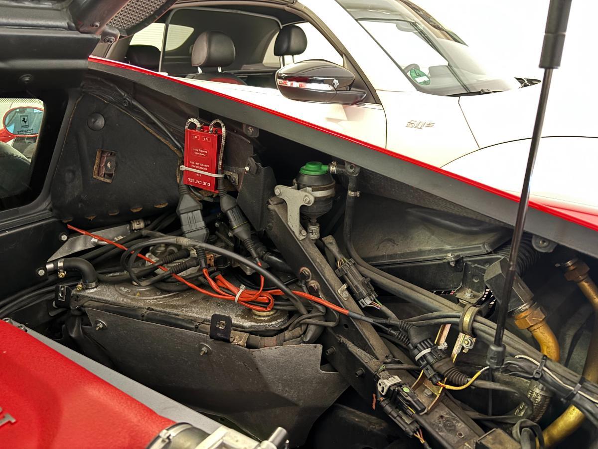 Hallo zusammen, plötzlich und unvermittelt hat mich mein 360er bei einer kurzen Runde mit der Slow-Down Meldung überrascht. War gerade gemütlich ca. 10km (kalt) losgefahren, dann erst falkernd, dann blinkend, dann dauerhaft Slow Down. Entsprechend auch mit Notlauf. Nach Zündungswechsel war dann Rückfahrt angesagt. Slow Down war aus. Der Fehlerspeicher zeigte mir die Ursache auf der Bank 1: Ich will so einen, wenn auch evtl. sporadischen Fehler immer gleich beheben. Also Jo.e kontaktiert. Er gab mir die Empfehlung erstmal die beide Kat-Temperatur Steuergeräte (Vescovini) mit der smart DOU CAT ECU von Scud Ing Swiss zu ersetzen, da meist das die Fehlerquelle ist. Vorteil von dieser ECU sind neben der Haltbarkeit/Zuverlässigkeit auch die weitere Funktionen, z.B. dass beide Kat-Temperaturen miteinander plausibilisiert werden. Oder eine openload, Kurzschlusserkennung, die dann nur einen Fehler anzeigt, nicht in Notlauf zwingt. Steht ja alles auf deren HP. Was ich schade fand, dass die Satus-LED über welche z.B. Fehler direkt ablesbar sind, oder das Erreichen der Kat-Betriebstemperatur >300°C durch schnelles Blinken angezeigt wird, in dem vorgeschlagenen Einbauort nicht sichtbar ist. Daher hier mein Tipp wie diese montiert werden kann um dann doch bei offener Klappe sichtbar wird. Siehe Bilder: Die Slow-Down war dann auch nicht mehr aufgeploppt. Die Kat-Temperaturen habe ich mehrfach ausgelesen, beim Aufheizen und nach schneller Fahrt. Sieht alles sehr plausibel aus und auf beiden Bänke ist es nahezu gleich warm Btw. In dem Zuge habe ich auch das Ersatz-Relais für die F1 (Smart EMT F1 Relais ECU) von denen geholt. In der Version mit der Monitoring-Anzeige. Einbau ist simpel. Schützt sowohl auf der Eingangseite meine neue Stradale-Getriebe ECU; wegen Relaisfunke und steuert sauber (niederohmig) F1 Pumpe. Überwacht zu lange und häufige Ansteuerungen und meldet die via dem LED Modul. Diese Mod kann also kein Fehler sein....