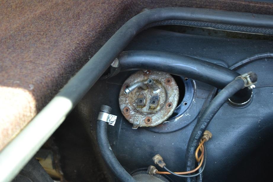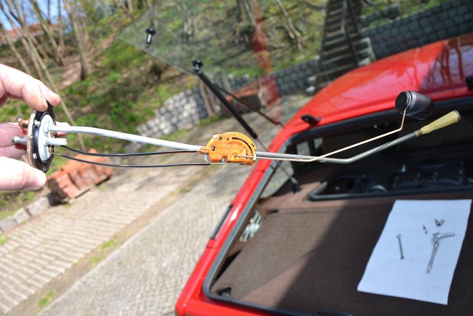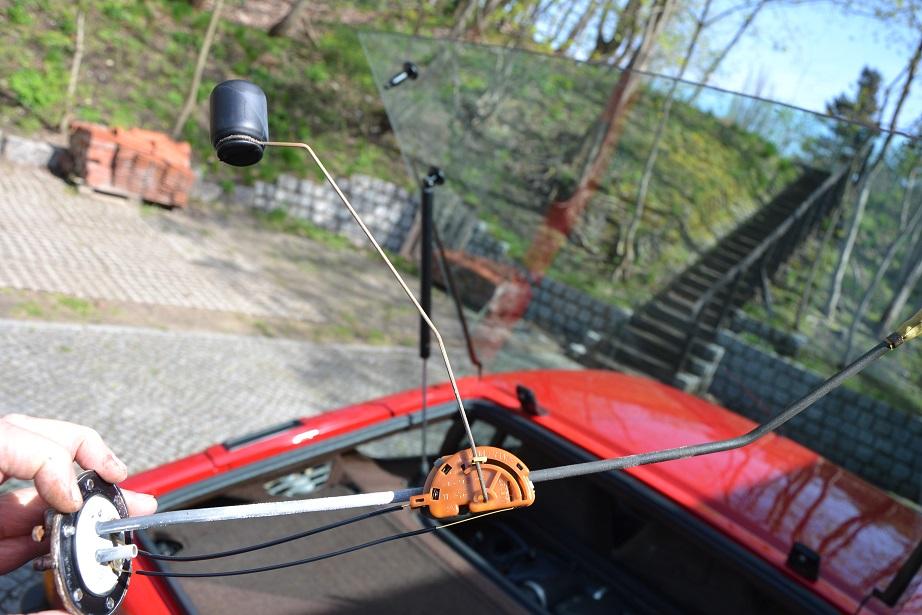 Wer jetzt eine silbere Zitrone erwähnt bekommt Ärger . Plötzlich war die Tankanzeige auf null, obwohl der Tank noch fast voll war. Zuerst dachte ich, ich hätte etwas bei Ausbau des Radios gekillt, eine Messung am Tankgeber, bei abgezogenen Kabeln, zeigte aber, dass selbiger nicht mehr funktionierte. Also zunächst ausgebaut. Hier sieht man dann die Funktionsweise, der Schwimmer am Ende des Armes bewegt den Hebel auf und ab. In dem gelblichen Gehäuse ist ein Widerstandsgeber. Durch das Rohr mit dem Sieb am freien Ende wird der Kraftstoff angesaugt. Meist liegt entweder ein Kontaktproblem vor, oder der Widerstand ist durch. Um das zu prüfen wird der Geber zerlegt. Nach vorsichtigem Aufbiegen von 3 Haltelaschen läßt sich das Plastikgehäuse von dem Metallträger lösen. Man erkennt links den bogenförmigen Widerstand, auf der Hebelachse sitzt ein Scheifer, der den Widerstand entlang läuft, je nach Hebelstellung. Nahe der Hebelachse erkennt man noch einen Kontakt, der für die Warnlampe "Tanken" zuständig ist. Oben ist ein Ende des Widerstandes kontaktiert. Der Warnkontakt ist rechts kontaktiert. Die Hebelachse und somit der Schleifer sind mit der Metallplatte kontaktiert, also Masse, nur im zusammengebauten Zustand natürlich. Das Anzeigeinstrument im Armaturenbrett wird also durch den (veränderlichen) Widerstand des Gebers nach Masse gesteuert. Der Widerstand sieht so aus. Es ist ein gewickelter Drahtwiderstand. Beim Ausdrücken aus dem Plastikgehäuse (ist nur gesteckt) muß darauf geachtet werden, dass man nicht den Draht beschädigt, also mit einem feinen Werkzeug nur dort am Träger des Widerstands drücken, wo kein Draht ist. Eine Prüfung (Durchmessen an beiden Enden) ergab, dass der Widerstand einwandfrei ist. Also alle Kontakte gereinigt, mit 1200er Schleifpapier eventuelle Oxidschichten entfernt, den Schleifer etwas "strammer" gebogen (vorsichtig und nur ganz leicht!), und alles wieder zusammen gebaut. Widerstand bei verschiedenen Hebelstellungen gemessen, alles fein und Tankgeber wieder eingebaut. 1 Stunde Arbeit, 0,-- Materialkosten.