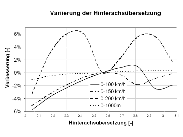 hab mal vor ner Zeit ein Excel Programm geschrieben, mit dem man Fahrleistungen berechnen kann. Hab mal bei einem E46 320d die Hinterachsübersetzung von -20% bis +20% variieren lassen, also von ca 2,0 bis 3,1 (Serie: 2,56). Hab mir die Ergebnisse in % Anzeigen lassen, um verschiedene Beschleunigungen miteinzubinden. Zum Diagramm: