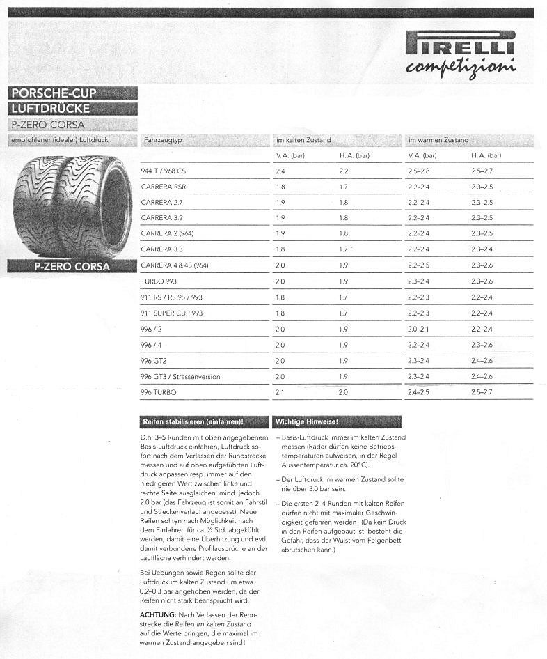 weiß jemand mit welchem Reifendruck man am Besten im kalten bzw. warmen Zustand auf der Straße und auf der Strecke, zum Beispiel mit den Cupreifen Pirelli Corsa, auf einem 2001er GT3 fährt?