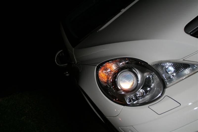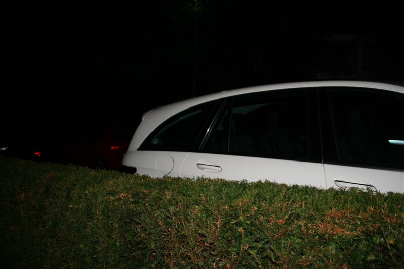 es ist bereits dunkel, die kauert vor der haustür... hm die farbe scheint silber zu sein - FERNLICHT -