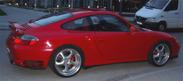 Zum Thema Farbe:Ich mache euch mal übers Wohenende paar Fotos,einen Silbernernen oder Schwarzen sieht mann sehr oft aber einen Roten mit 19Zoll Felgen mit Tiefbett und hinten 315er Bereifung(Schau hinten Mega Breit aus) steht nicht überal.Vom Effekt wenn ich durch die City fahre schaut wirkich jeder änlich wie beim Ferrari am anfang ist es lustig aber auf die dauer nervt es sehr.Und so viele Turbos fahren in München auch nicht rum 996Carrera oder Boxter wie sand am mehr.