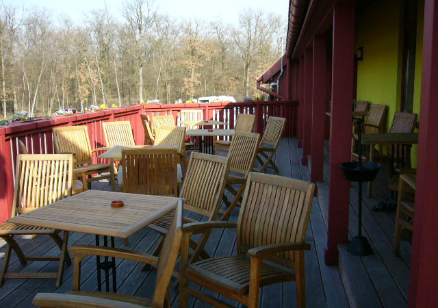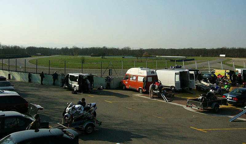 Hier noch ein Bild von der Terasse auf die Strecke, links die Boxenausfahrt, rechts die Einfahrt. Rechts vom Kiesbett ist im Wald der Hängerparkplatz.