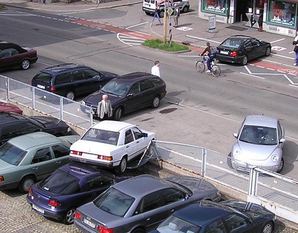 Die 86. jährige Fahrerin des weißen Mercedes hat beim Ausparken auf der gegenüberliegenden Strassenseite das Gas mit der Bremse verwechselt.