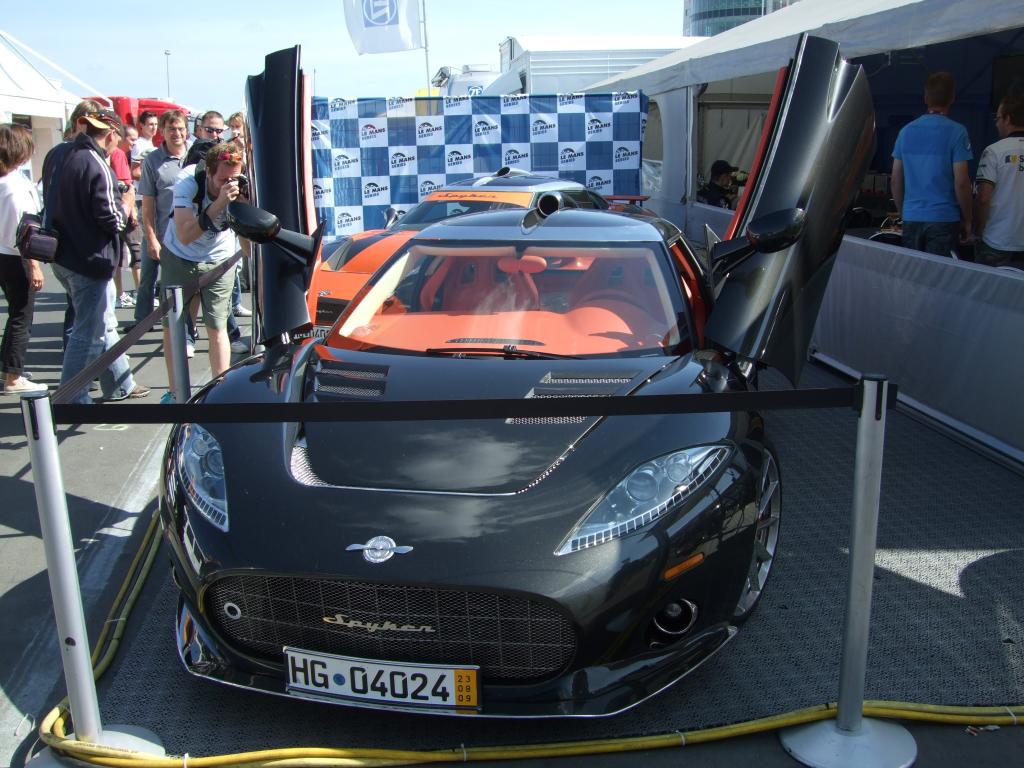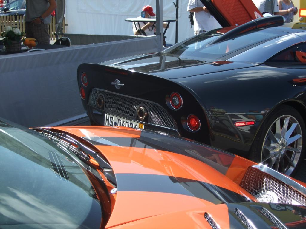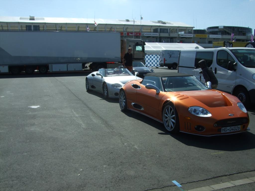 Der silberne hat eine Dortmunder Zulassung und ist hier in CP (liest aber mehr als das er schreibt). Der Aileron ist einer von zwei Vorführwagen, die momentan um die Welt touren (der zweite ist rot) und der LM85 und der orangene Spyder sind Werkswagen, in diesem Fall mit Kurzzeitkennzeichen von Spyker Frankfurt (sitzen in Bad Homburg, daher HG-Kennzeichen).