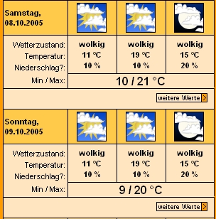 Von Donnerstag bis Samstag am Vormittag jeweils hochnebelartig bewölkt. Am Nachmittag Aufhellungen und zunehmend sonnig bei 18 Grad. Am Sonntag recht freundlich. Bis 20 Grad.