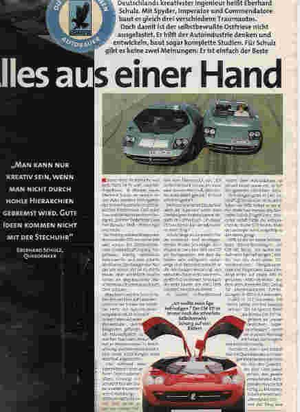 Der Imperator hat jetzt schon einen CW- W ert von 0,3 8 , inklusive Wischer, dicken Reifen und Rückspiegel. Zudem entwickelt er kaum Auftrieb an Vorder- und Hinterachse, wie eine Überprüfung im Mercedes- Windkanal ergeben hat. Das ist eine prächtige Bestätigung für die technische Leistung des Eberhard Schulz, der ja nur zur Nachmessung auf einen Windkanal zurückgreifen konnte.