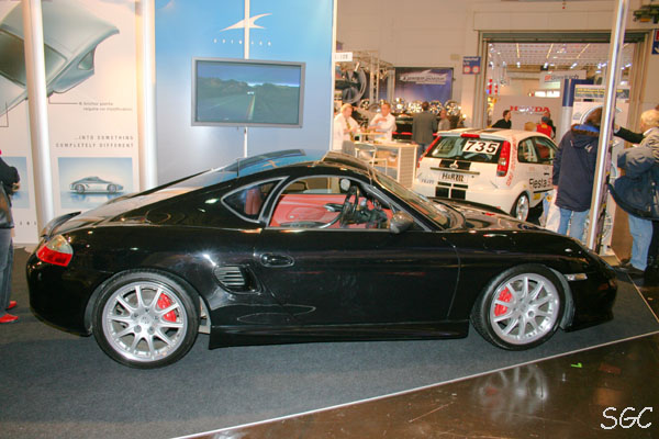 Am 1. Messetag trug das ausgestellte Fahrzeug (Boxster 986 mit 997 – Front) noch das Porsche – Emblem auf der vorderen Haube, später war es dann abgeklebt…