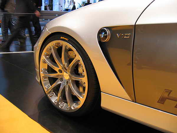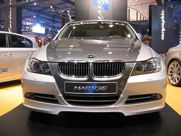 Zuallererst fällt die zweifarbige Lackierung, die Motorhaube und Kotflügel mit speziellen Luftauslässen sowie die HARTGE Frontspoilerlippe und der HARTGE-Heckspoiler ins Auge. Der 3er BMW aus dem Saarland – genauer der HARTGE H50 V10 – ist ein Meisterwerk – und das nicht nur optisch. Vor allem unter der thermodynamisch optimierten Haube haben die HARTGE-Ingenieure und –Mechaniker etwas Außergewöhnliches vollbracht. Ausgestattet mit einem überarbeitetem M5 V10 Motor, einem 7-Gang SMG-Getriebe und dem HARTGE-Modul zur Aufhebung der Vmax-Begrenzung bis 320 km/h bringt der H50 V10 seine ganze Kraft auf die Straße: 550 PS und ein Drehmoment von 520 Nm. Dazu kommen eine verstärkte Hinterachse und ein speziell abgestimmtes Fahrwerk, das sowohl in der Höhe als auch in Zug- und Druckstufe verstellbar ist. Neu bzw. eigens für den HARTGE H50 V10 angefertigt ist auch die Edelstahl-Abgasanlage, die den V10-Sound zum akustischen Genuß werden läßt. Der Kunde hat die Wahl zwischen zwei ovalen oder runden Doppelendrohren. Die Rad-/Reifenkombination besteht aus 9,0 x 20 ET40 vorn und 10,0 x 20 ET40 hinten mit 245/30 ZR 20 bzw. 285/25 ZR 20 vonContinental. Last but not least: der HARTGE H50 V10 im Innern: