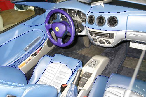 Also ein F360 Spider, perlmut weiß außen, innen wie gesehen zweifarbiges Leder, dunkle Farbe Hellblau(Eisblau), helle Farbe weiß, dunkelblaue Kontrastnähte, dunkelblaues Lenkrad, Fußmatten dunkelblau oder dunkelbgrau / anthrazit (ähnlich dem verändertem Bild)