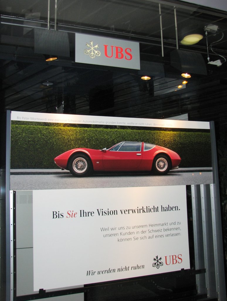 Hier mal ein Bild eines Schaufensters einer UBS-Filiale mit der Monteverdi (Hai)-Werbung. Inserat folgt.