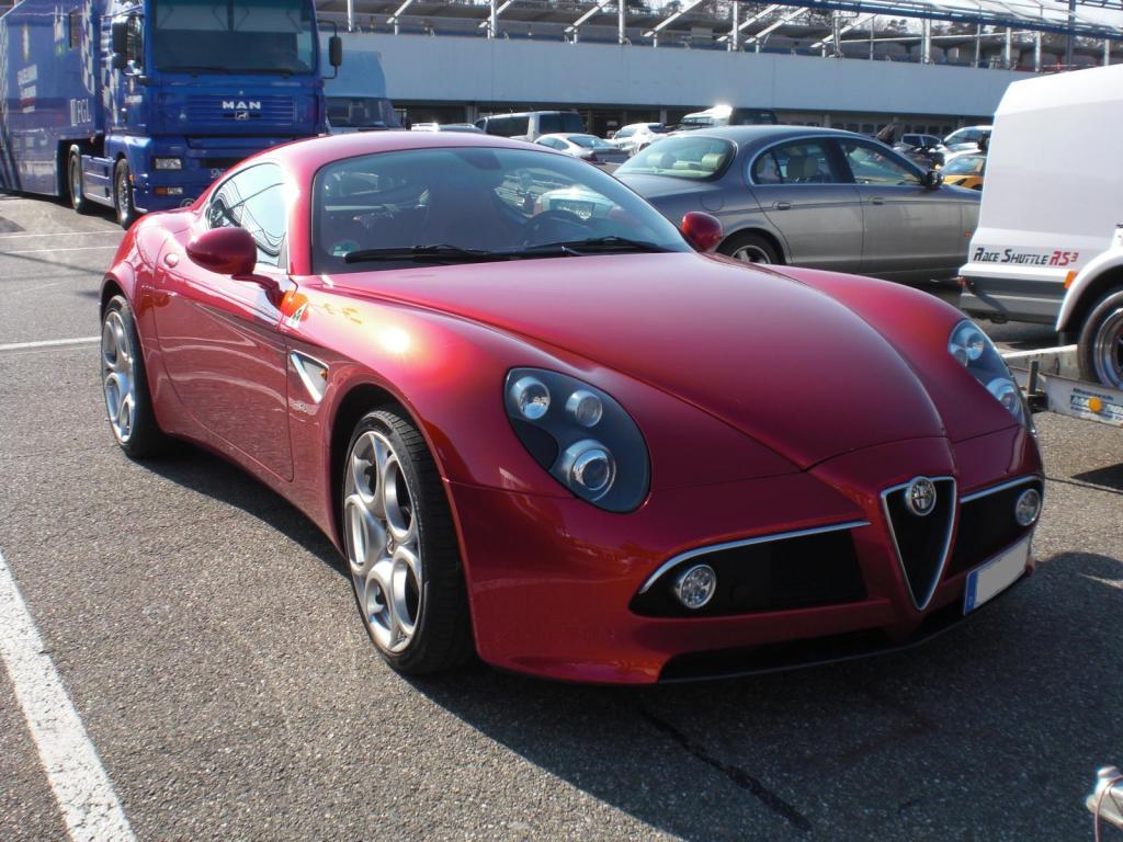Wenn es denn aber an dem Schaustück italienischer (und deutscher) Designkunst etwas zu kritisieren gibt dann am vielleicht nicht mehr wirklich modernen Fahrwerk, welches obwohl mit Transaxle und doppelter Querlenker rundum gesegnet nicht an die Präzision und den Komfort moderner elektronisch geregelter Dynamiker heranreicht. Die Alfa Speerspitze kann immerhin (im Gegensatz zum Ferrari California!) eine Trockensumpfschmierung aufweisen, welche eine besonders tiefe und mittige Einbaulage des V8 ermöglicht. Das Chassis des 8C ist um Straffheit und Verbindlichkeit bemüht, neigt in der Kurve nur leicht zur Schräge und doch vermisst man die letzte Neutralität am Limit die zum Beispiel einen ähnlich arrangierten 599 GTB auszeichnet. Im Gefecht um die optimale Rundenzeit fehlt es dem 8C an Grip und Abtrieb. Auch eine Keramikbremse gibt es nicht. Aber wer will ihm das eigentlich verdenken? Zumindest begleitet die Lenkung eine angenehme Schwere, sie setzt Richtungswechsel direkt um, zeigt sich kontaktfreudig mit Fahrer und Straße. Der 8C schneidet die Kurven nicht wie ein GT3 oder Scuderia. Sei’s drum, den Wagen trägt man nicht zum Duell. Man zitiert ihn zum Ausflug mit der Freundin an den Gardasee. Am Besten noch mit den maßgefertigten Gepäckset für den „opulenten“ Kofferraum. Die dynamischen Talente des 8C reichen im Ernstfall in jedem Fall aus um die Gesichtsfarbe der Begleitung nachhaltig zu verändern, wenn es denn sein muss. Laut Aussage eines Alfa Testfahrers bleibt die Uhr immerhin bereits nach 7:58 auf der Nordschleife stehen. Aber nach Details dazu frägt nur derjenige, der sich das Auto ohnehin nicht leisten kann.