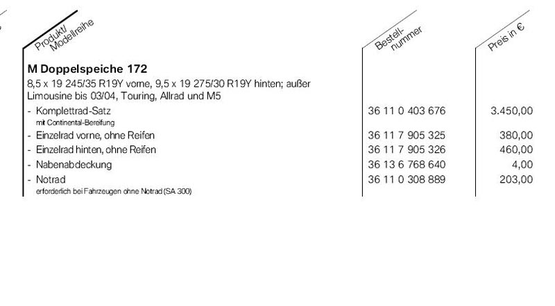 Edit kleiner Tip: Die Gesamte Preisliste für alle Felgen etc. von BMW gibt es auf der HP etwas versteckt zum Download unter (Modell wählen z.B: 5, Limo oder Kombi wählen, Rubrik Original BMW Zubehör und dann im neuen Fenster Preislisten)
