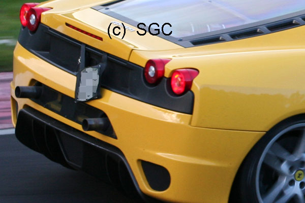 Hinten: zwischen den Auspuffrohren ist genug Platz. Der Pista hat eine andere Heckschürze als der F430, die Fläche für das Nummerschild ist größer als beim Serienwagen, so daß neben den Endrohren auch noch ein Schild Platzt hat. Das Schild sollte halt vielleicht nur etwas hitzebeständig sein. :)