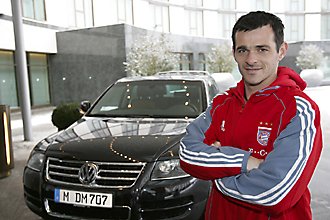 Wolfsburg, 11. März 2006 - Bayern-Fußballer Willy Sagnol fährt Volkswagen Touareg. Der französische Abwehrspieler vom Rekordmeister FC Bayern München übernahm heute vor dem Ritz Carlton in Wolfsburg einen Volkswagen Touareg W12.