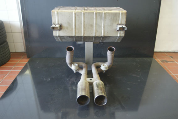 Ein Bild zeigt den ausgebauten Originalauspuff. Was für ein Riesenkasten :-)