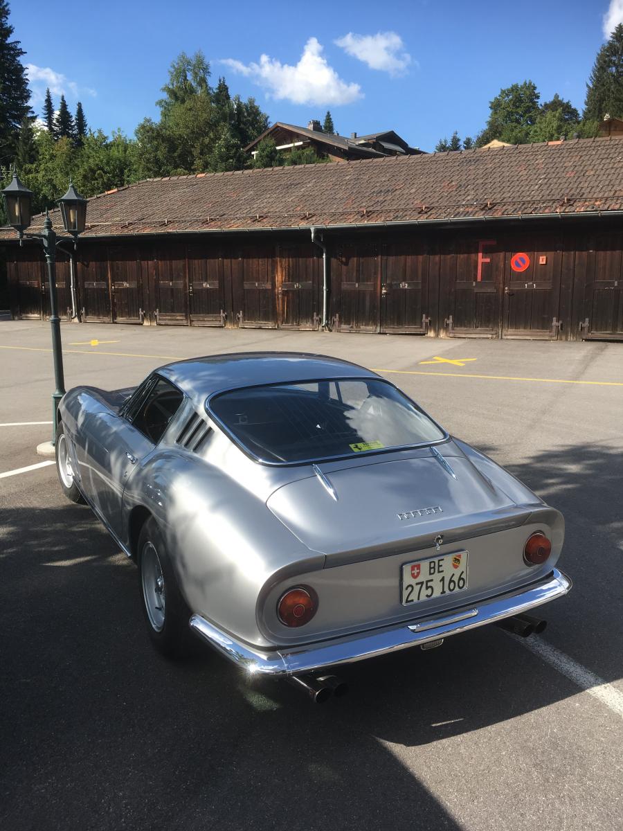 Hochinteressantes Foto. Es dürfte mit an Sicherheit grenzender Wahrscheinlichkeit den 275 GTB/2 Longnose mit Chassisnummer 08457 zeigen, welcher damals dem Privatrennfahrer Helmut Felder aus Remscheid gehörte. Kennzeichen RS-T 275. Die Farbe (Amaranto) und die ungewöhnliche Positionierung zweier Außenspiegel auf den vorderen Kotflügeln dürfte in dieser Kombination in Deutschland einmalig gewesen sein.