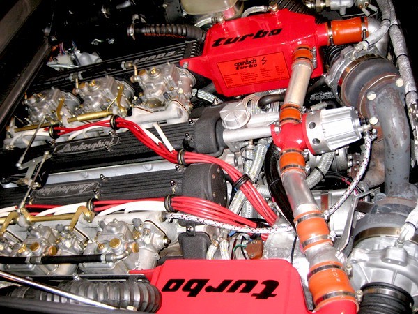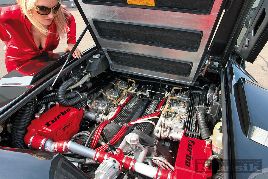 But it's a long way to get there. The conversion of an old Lambo V12 with six twin-throat Weber 45 DCOE carburetors to state-of-the-art turbo technology is no Sunday outing. Only a modern injection guarantees impeccable function and so the Tyrolean Gyro Gearloose developed a custom-made, electronically controlled system, which also uses the informations from the lambda sensors of the equally selfmade four-pipe exhaust system including three-way catalysts. Yes, this Countach even has catalysts!