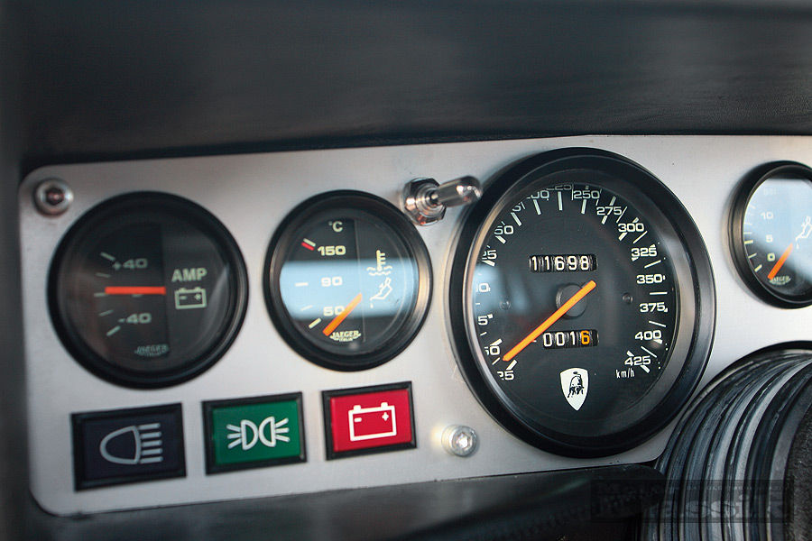 A high performance clutch including sintered-metal linings doesn't really make daily driving with the two-seater car easier but it seems to be able to stand the power of the tuned engine. But to ensure that the clutch doesn't torture the left leg too much while driving rearwards sitting on the side pane l, Gruber upgraded the Countach with a back-up camera, which makes safe manoeuvring from the driver's seat possible.
