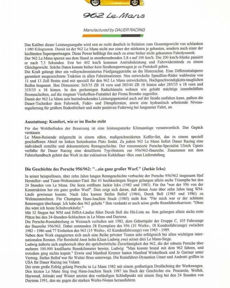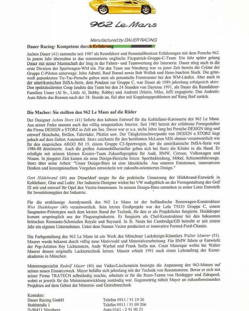 Der Gelbe Dauer 962 mit grünem Interieur ist nicht das gleiche Auto wie der Gelbe Dauer 962 Chassis 133 mit rotem Interieur. Beide sind im AMSTV Beitrag von 01/98 gleichzeitig nebeneinander zu sehen: 153688072_3742024965886484_4031644553711Der Gelbe 962 mit grünem Interior ist der erste Prototyp, das IAA Fahrzeug und war bis ende der Dauer Sportwagen GmbH im Besitz von Jochen Dauer. Dieses Auto ist letztes Jahr auf YouTube wieder aufgetaucht: