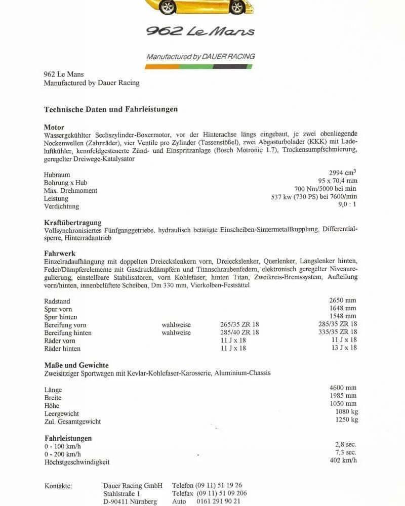 Weitere Ungereimtheiten treten mit dem gelb gestreiften Chassis auf. Hier im Thread wurde vermutet das es sich um TP1214153400 handelt. Die Einlassung in der Rückwand der Fahrgastzelle zeigt eindeutig das es sich beim gelb gestreiften Auto um Chassis 962 8-001 handelt, ein experimentelles Chassis von Porsche um einen 928 Motor im 962 zu testen. Der Fahrzeugschein von Chassis TP1214153400 listet dieses Fahrzeug mit 450kW und 285 und 340 Reifenbreiten. Diese Werte stimmen mit dem Dauer 962 Le Mans GT überein. Außerdem wurde mehrfach in diesem Thread darauf angedeutet das Chassis 8-001 über 800PS besitzt und dies würde weiter unterstützen das es sich bei TP1214153400 und 8-001 um unterschiedliche Fahrzeuge handelt. In den USA ist die Karosserie eines Dauer 962 Le Mans GT samt unbekanntem Chassis aufgetaucht. Meiner Vermutung nach könnte es sich dabei um TP1214153400 handeln, aber die Daten der schwedischen Zulassungsbehörde würden dagegen sprechen: https://biluppgifter.se/fordon/YBF065 . Chassis TP1214153400 wurde 2001 in Deutschland zugelassen unter N-PO962 falls also jemand ein Foto von einem Dauer 962 Le Mans oder einem Dauer 962 Le Mans GT mit dem Kennzeichen N-PO962 hat wäre dies sehr hilfreich.