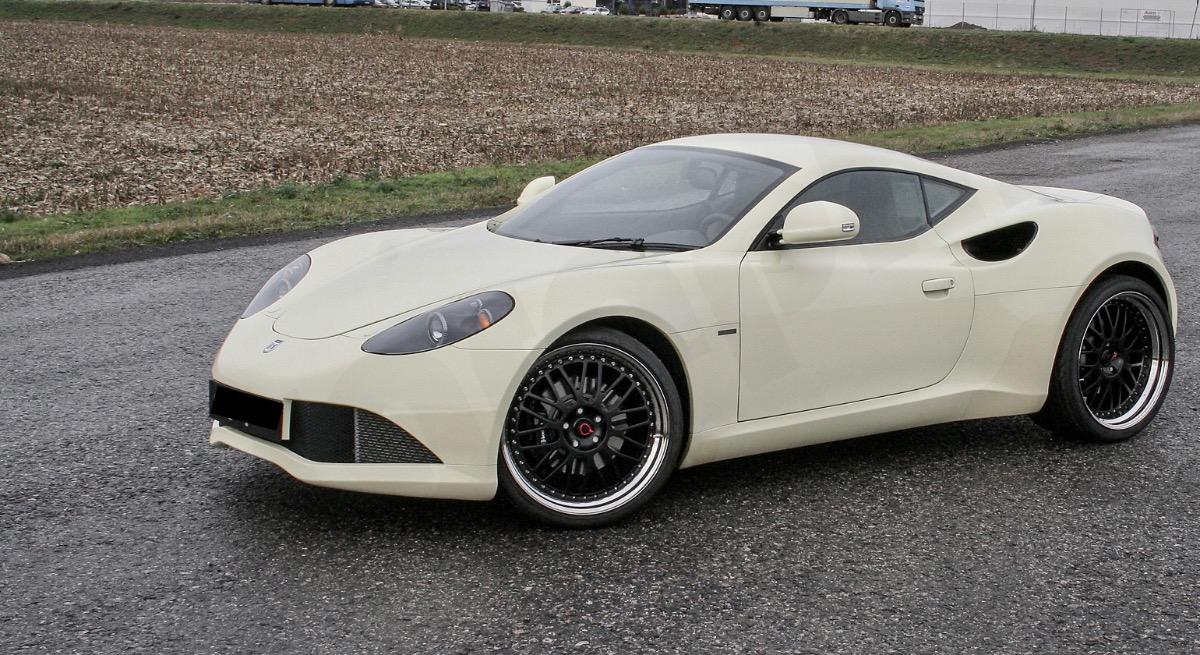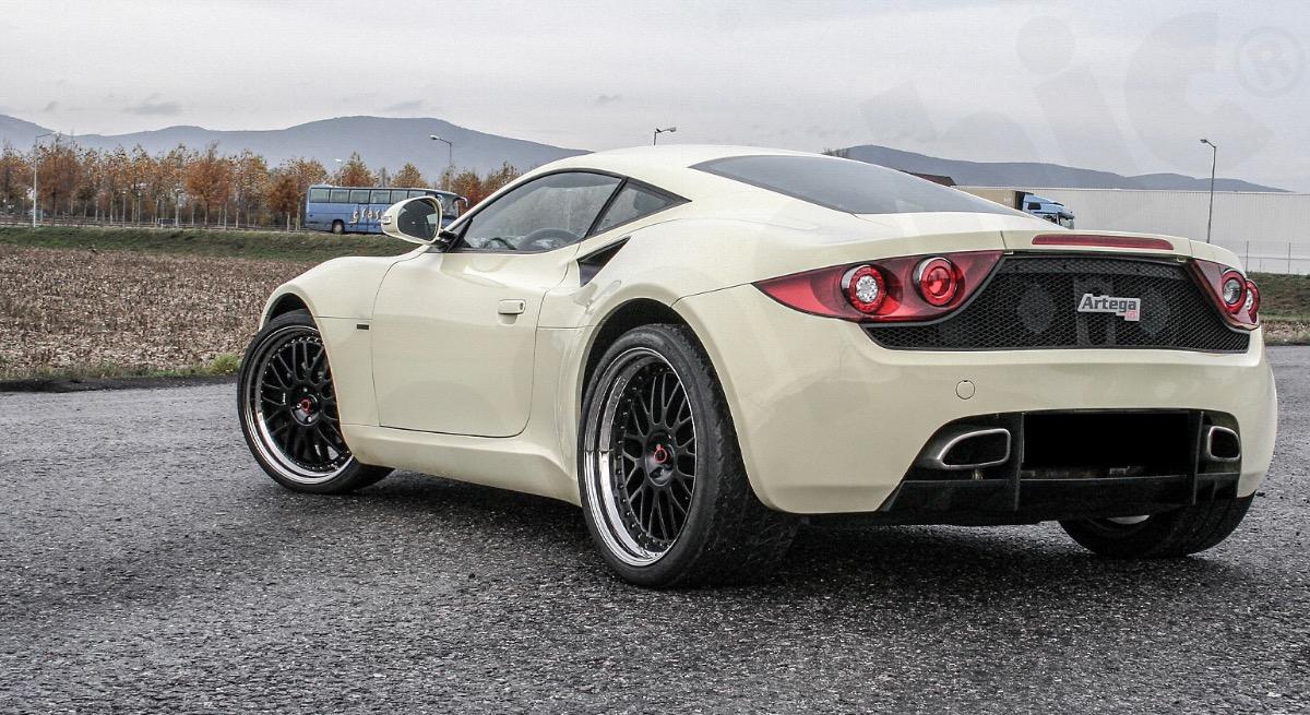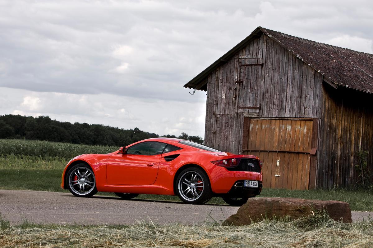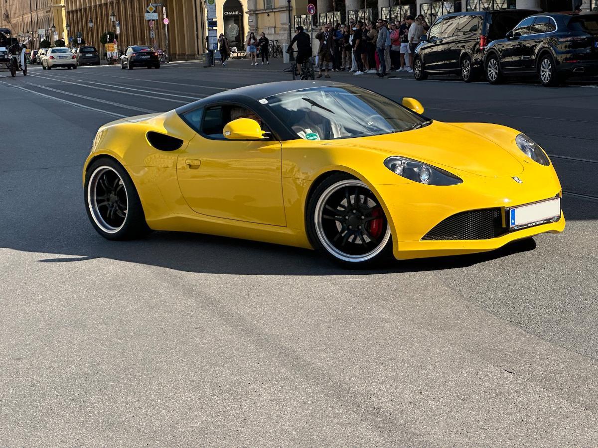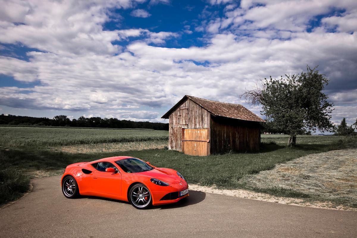 Von meiner Haustür drei Dörfer weiter gab es damals eine Artega-Niederlassung. Die hatten zu der Zeit zwei Vorführer, einen Beigenen und einen Roten. Später kam ein Schwarzer dazu. Die Fahrzeuge fuhren gefühlt non-stop durch die ganze Region und zogen stets reges Interesse auf sich. Auch von mir. Speziell in rot sah der Wagen nicht schlecht aus. Der beigene Artega wurde von einem Fahrzeugtuner (ebenfalls hier aus der Region) dann mit neuen Rädern + Fahrwerk bestückt. Sah dann so aus: