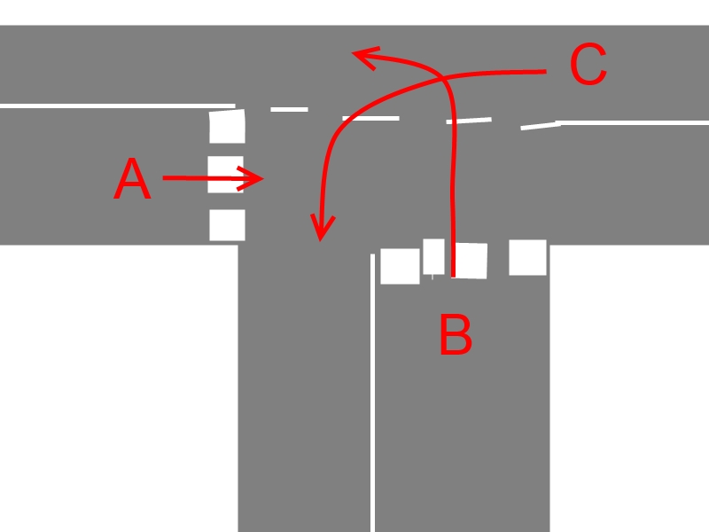 In diesem Falle war es so, dass zunächst die Fördermaßnahmen für den umweltfreundlichen Verkehr zum tragen kamen und Radfahrer "B" als erstes seine Fahrt fortsetzen durfte. Da ich nun niemanden zum Warten hatte, ist meine Wenigkeit "A" auch losgefahren. In der Zwischenzeit hatte sich Frau "C" entschieden, dass sie doch nicht links abbiegen, sondern geradeaus fahren möchte.