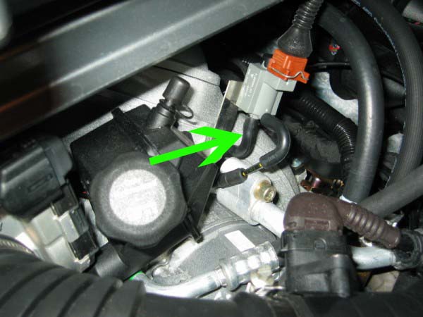 Von diesem Stecker mußt Du DEN MITTLEREN GUMMISCHLAUCH abziehen, also den Schlauch, auf den der Pfeil zeigt (siehe unten angefügtes Bild). Der Schlauch kann abgezogen bleiben. Wenn Du Dir Gedanken machst, daß so ein abgezogener Schlauch im Motorraum auffallen könnte, dann kannst Du den Schlauch mit einem geeigneten Stopfen verschließen und anschließend wieder auf den Stecker aufstecken.