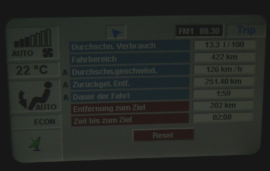 So, ich habs mal fotografiert. Wenn mir jetzt einer kommt, dass der Schnitt 126 km/h bzw. 129 km/h nicht viel ist und konstante Fahrt ja eh nicht gerechnet werden kann, der sollte mal drüber nachdenken, dass