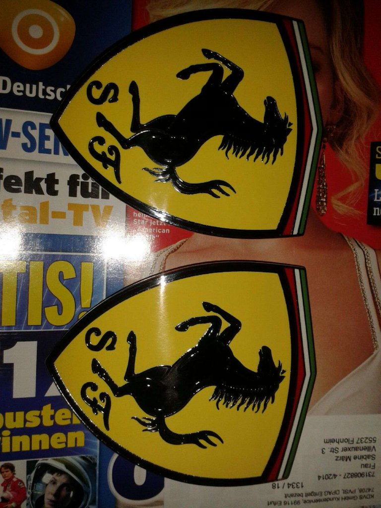Also wenn Du die Originale in den Vertiefungen hast und nicht die Schweinepreise bei Ferrari bezahlen willst, hätte ich an Deiner Stelle kein Problem damit , in die Vertiefungen Die Replicas zu kleben. Die sind von den Originalen nicht zu unterscheiden und auch in der passenden Dicke erhältlich. Kosten tun sie aber nur eine. Bruchteil