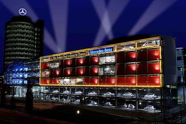 Dort ist eine Mercedes Niederlassung mit einer unglaublichen Schaufensterfront.