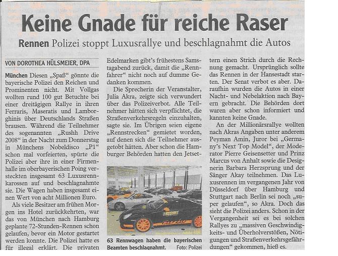 habe nicht den ganzen Thread gelesen. Ich weiß aber, dass der Bayerische Verwaltungsgerichtshof 2005 entschieden hat, dass vor Sicherstellungen ein gerichtlicher Entscheid beim Verwaltungsgericht einzuholen ist. Die jetztige Maßnahme verstößt außerdem gegen das Übermaßverbot. Ein Verbot der Veranstaltung heißt nicht, dass man den Leuten noch zusätzlich für ein verlängertes Wochenende die Autos sicherstellen darf. Vor allem nicht ohne Gerichtsbeschluss. Von Gefahr im Verzug kann keine Rede sein, da die Regierung von Oberbayern rechtzeitig davon wusste. Man hat es einfach nicht für notwendig erachtet und den Richtervorbehalt ausgehebelt in der Hoffnung, dass es niemand prüft. Ich fand es unerträglich und habe einem Teilnehmer, der schon am Freitag nach Frankfurt zurückfahren wollte einen guten Anwalt verraten, der sich um die Sache kümmert.