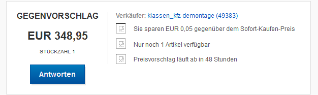 das war der Gegenvorschlag auf einen realistischen Preisvorschlag in Höhe von 5€. Immerhin kommen ja eh noch fast 40€ Versand dazu :D