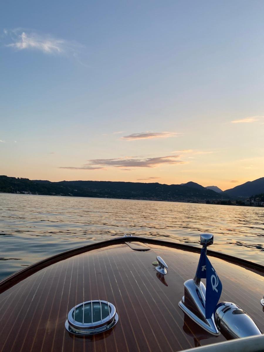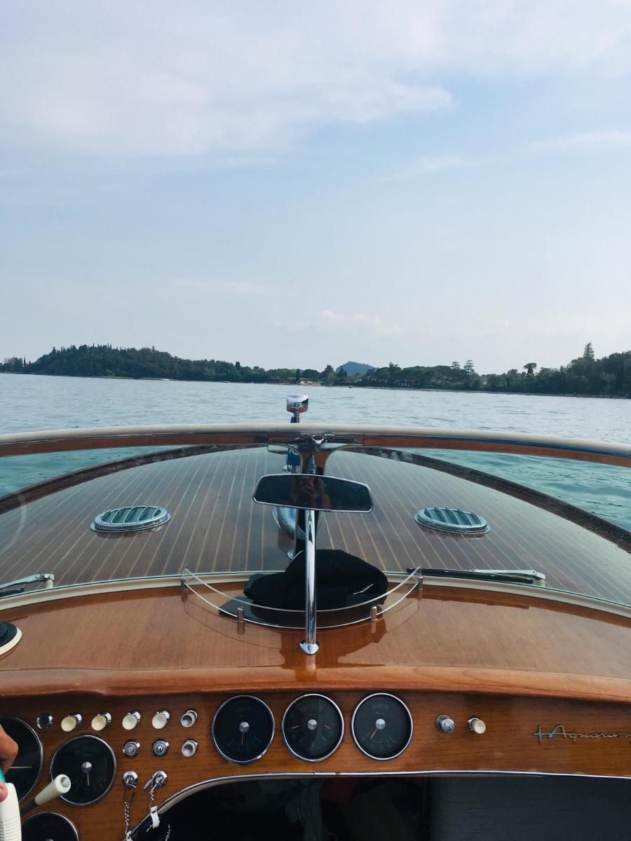 Eine kleine Riva Florida im Hafen des San Vigilio mit einem Teil des Haupt- und Nebengebäudes des Hotels im Hintergrund. Das Fenster ganz oben rechts gehört zur Suite, das Fenster oben im Hauptgebäude links zu Zimmer 4. Unter  den Lauben die seit jeher ein wenig spartanisch geratenen 2er-Plätze mit Blick auf den ganzen kleinen Hafen und den See.