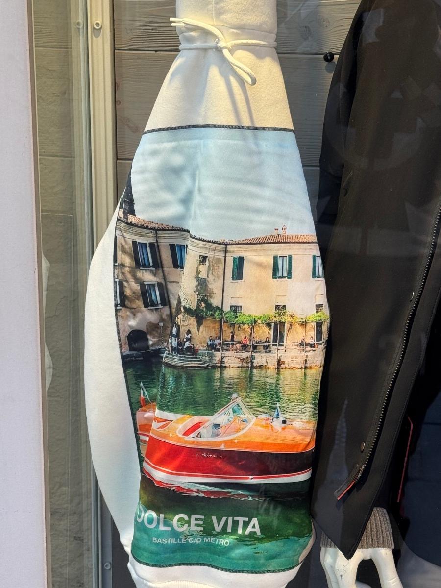 In einem Modeladen in Garda bieten sie exklusiv solche Pullover/Jacken/Shirts an. Es gab auch noch welche mit der Aquarama „poor but sexy“, aber da war das Boot im Hafen im Vordergrund, das San Vigilio konnte man da nur schemenhaft erkennen.