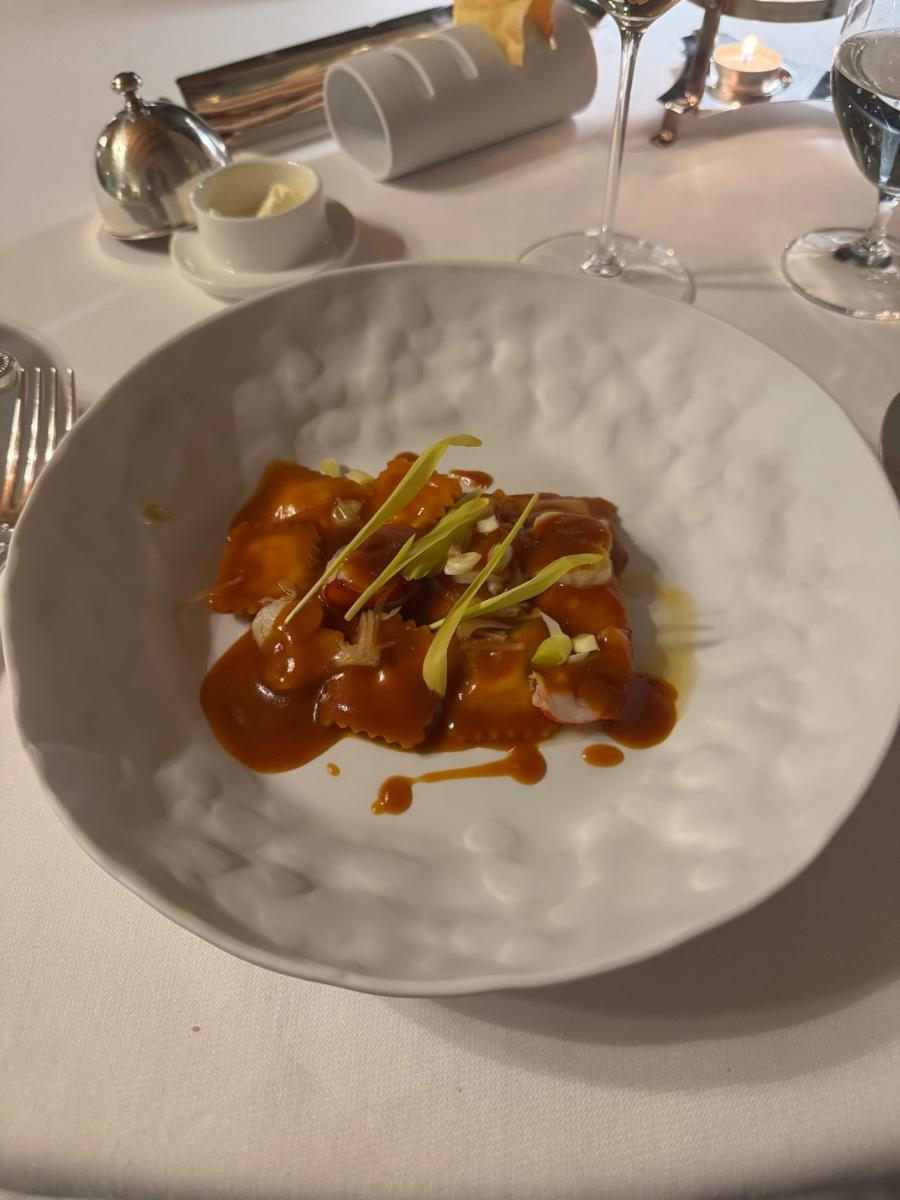 Nach einem noch recht beeindruckenden speziell auf den jeweils georderten Aperitif abgestimmten Amuse Gueule ging’s für mein Empfinden danach leider jeweils ein wenig bergab. Während das auch dort von mir bestellte pochierte Ei noch solide und gelungen geriet, waren die mit Hummer gefüllten Ravioli danach von der Portion eher lupenmäßig für knapp unter 40 Euro.